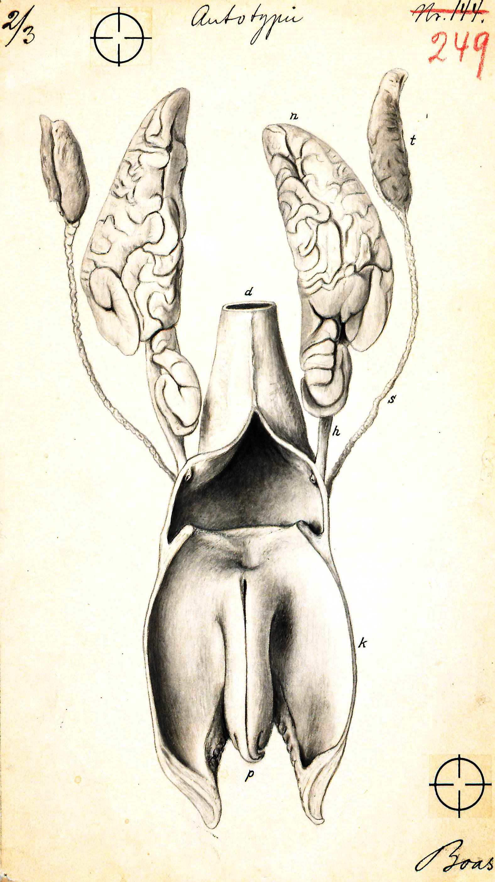 Herunder nogle få eksempler på originale tegninger til Boas' Lærebog i Zoologien (LZ) 1888 + 2./3. udgaverne 1894/1905 og unika illustrationer til Boas' almene skolebøger Lærebog i Dyrerigets Naturhistorie (LDN) 1892 og Lille Naturhistorie (LN) 1903. Biblioteket har en stor del af disse originaler i en særsamling. Desuden præsenteres nogle få tavler fra The Elephants head.