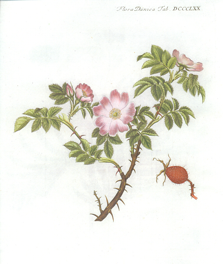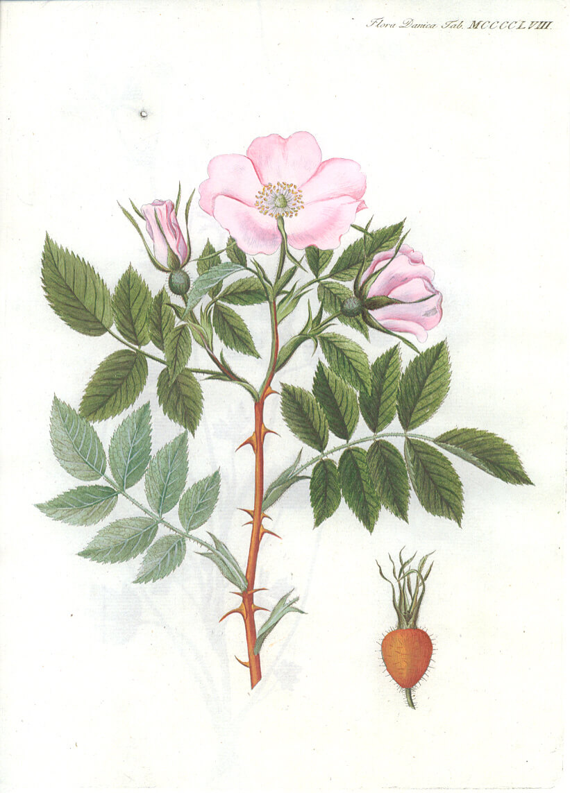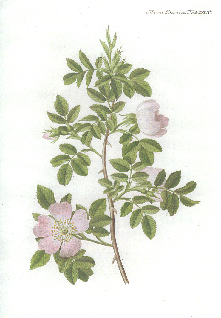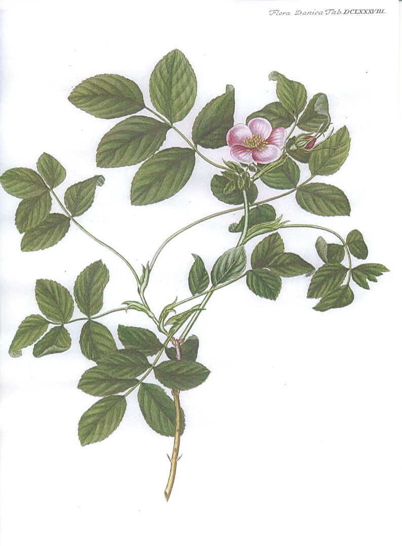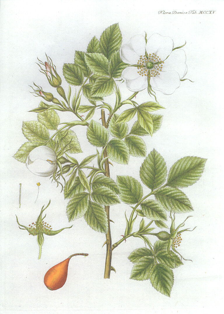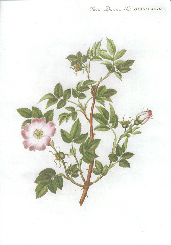 Udvalg af illustrationer af de vilde danske roser (Hele Flora Danica er online tilgængelig via Det Kgl. Bibliotek) |