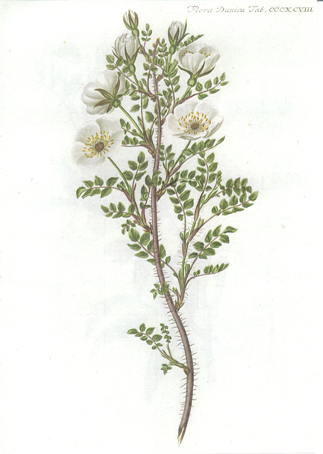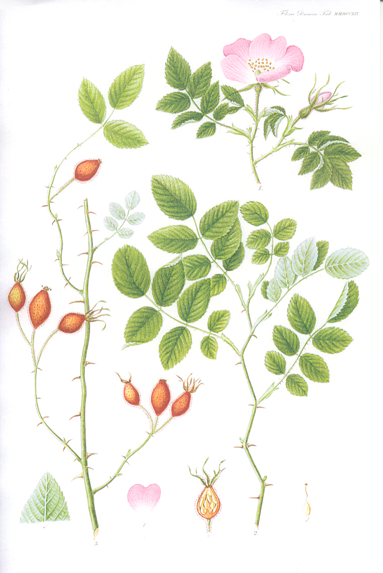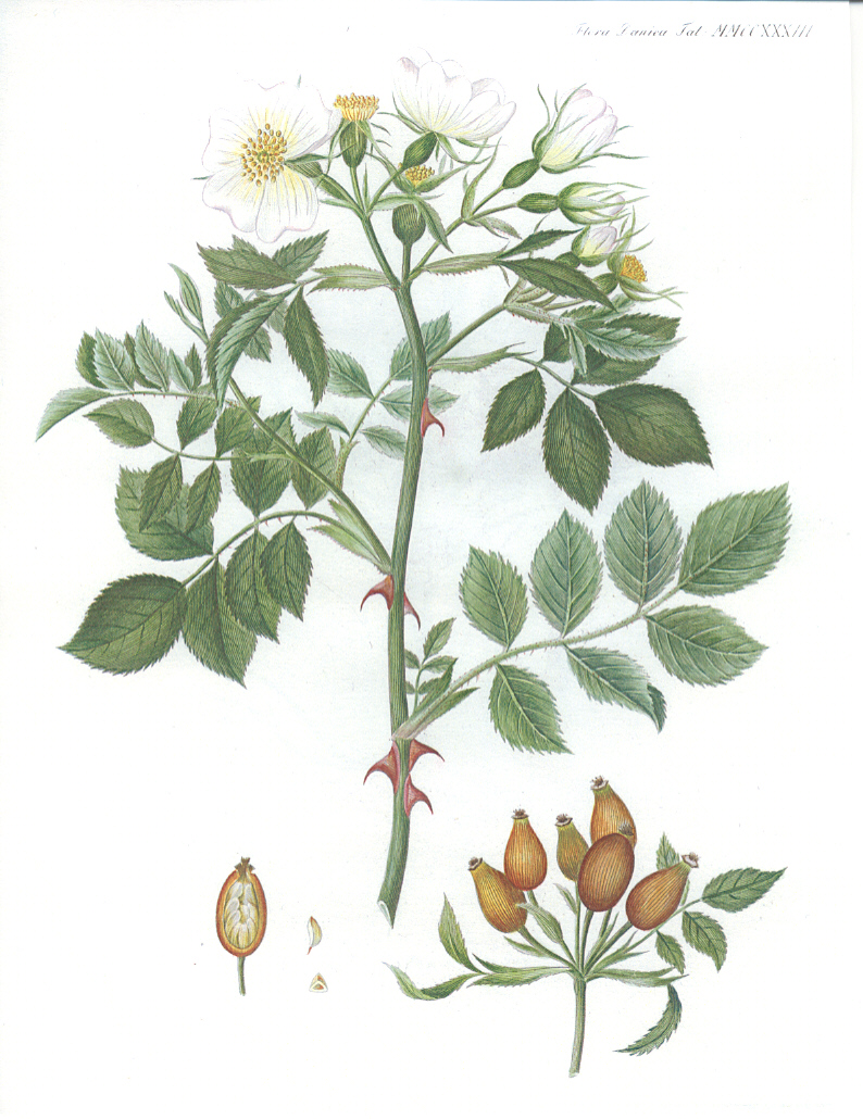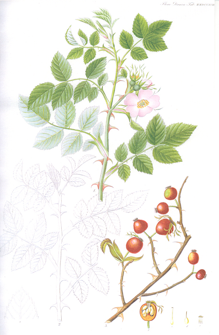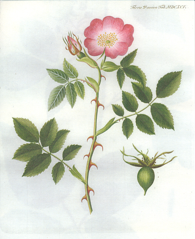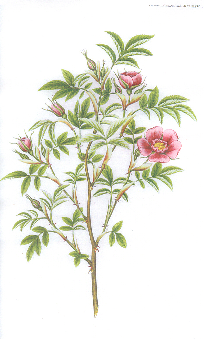 Udvalg af illustrationer af de vilde danske roser (Hele Flora Danica er online tilgængelig via Det Kgl. Bibliotek) |