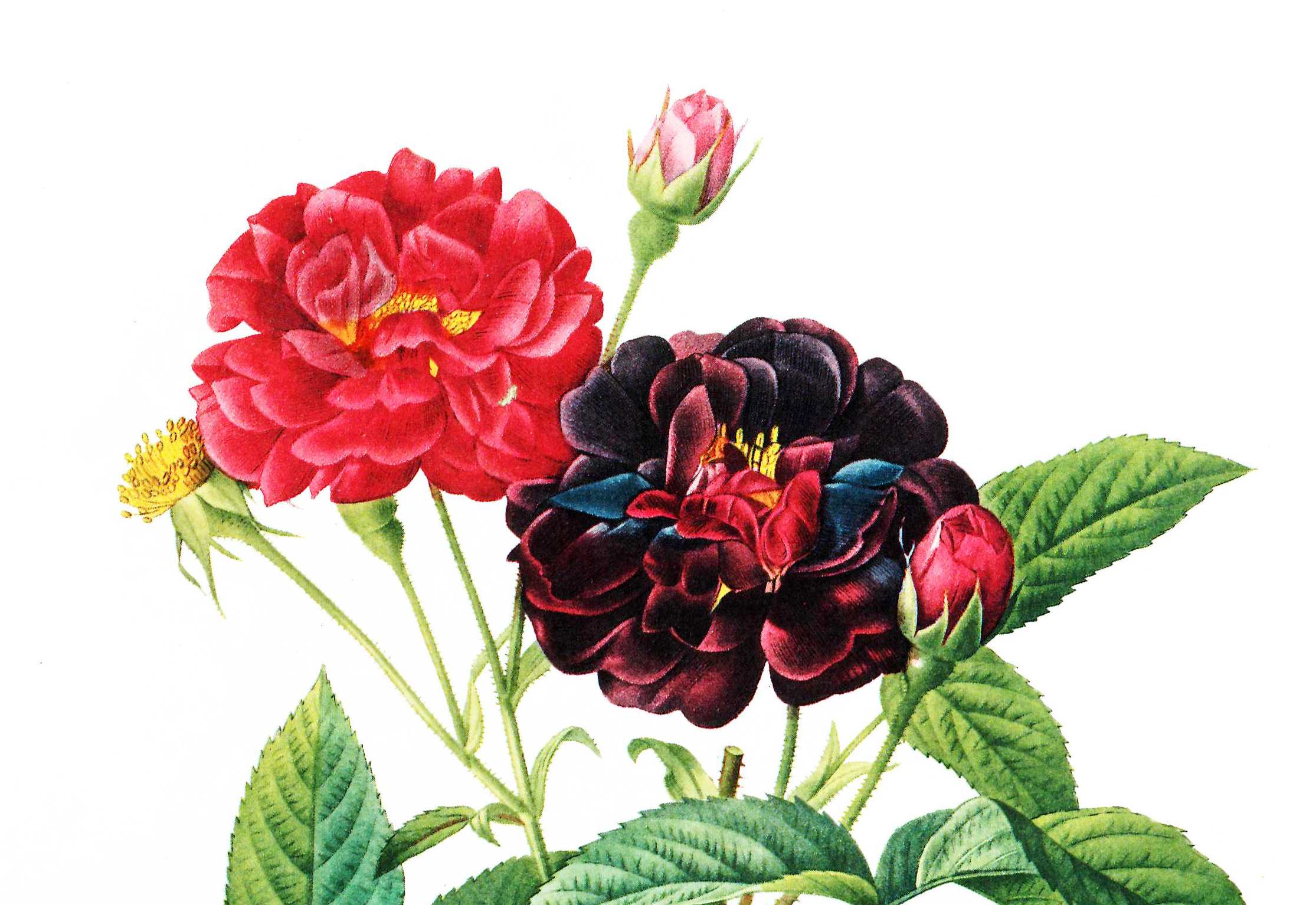 Biblioteket har en del af de mange bøger, der findes om 'blomsternes dronning'. Herunder vises udvalgte illustrationer fra nogle af bibliotekets historiske billedværker - bl.a. det botanisk-hortikulturelle mesterværk "Les Roses" (1817-1824) med 168 tavler i 3 store bind af 'blomsternes Rafael' Pierre-Joseph Redouté (1759-1840). Bibliotekets udgave er en faksimileudgave fra 1978 suppleret med et stort kommentarbind.